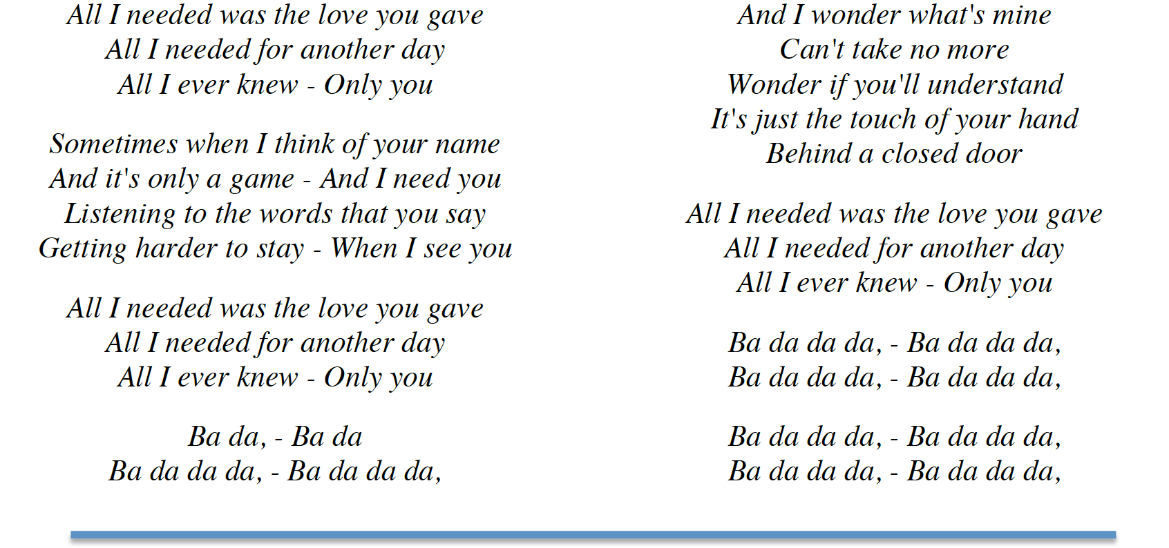 All I needed was the love you gave All I needed for another day All I ever knew Only you Sometimes when I think of your name And it's only a game And I need you Listening to the words that you say Getting harder to stay When I see you All I needed was the love you gave All I needed for another day All I ever knew Only you Ba da, Ba da da da, Ba.